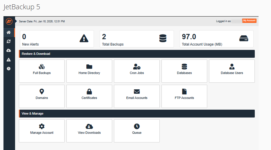 JetBackup ana ekranı üzerinden hosting hesabınıza dair pek çok unsuru ayrı ayrı yönetebilirsiniz: