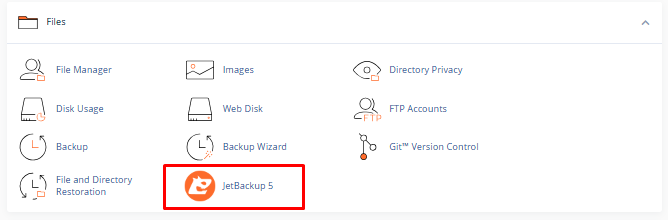 Hosting kontrol panelinize giriş yaptıktan sonra, “Dosyalar” veya “Ek Özellikler” bölümünde yer alan JetBackup ikonuna tıklayarak arayüze erişebilirsiniz.